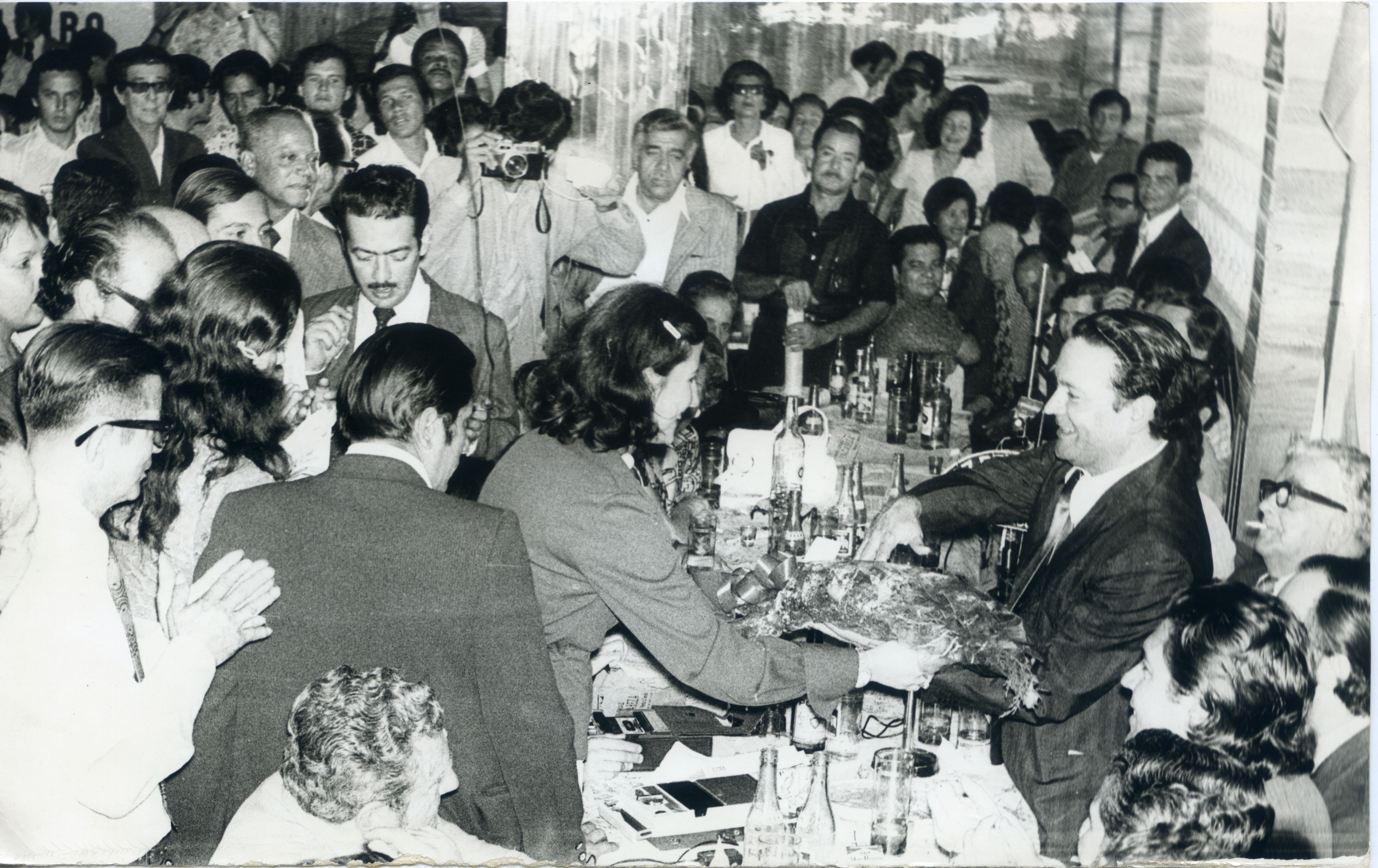 Humberto González Narváez, gobernador del Valle del Cauca. Fue gobernador en dos ocasiones: 1964 - 1966 y 1981 -1982. También se desempeñó como ministro de comunicaciones en 1970, durante el gobierno de Misael Pastrana. Se aprecia al gobernador con la comunidad en evento. Observamos mujer entrega detalle al gobernador