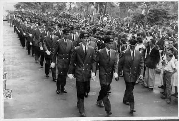 Celebración de los 25 años del Cuerpo de Bomberos, desfile por la carrera primera frente al parque Uribe. Primera fila izquierda, Gustavo A. Ortíz, Gustavo Sánchez Puente (centro). Segunda fila, izquieda. Pedro C. Tercera fila, izquierda Mario Puente. Cali. C. 1953.