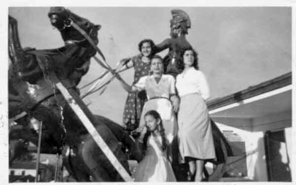 loria Guerrero y sus amigas María Teresa Arizabaleta e Isabel Quintero, posan al lado de la escultura La Cuadriga del Progreso que se encontraba en la carrera 4