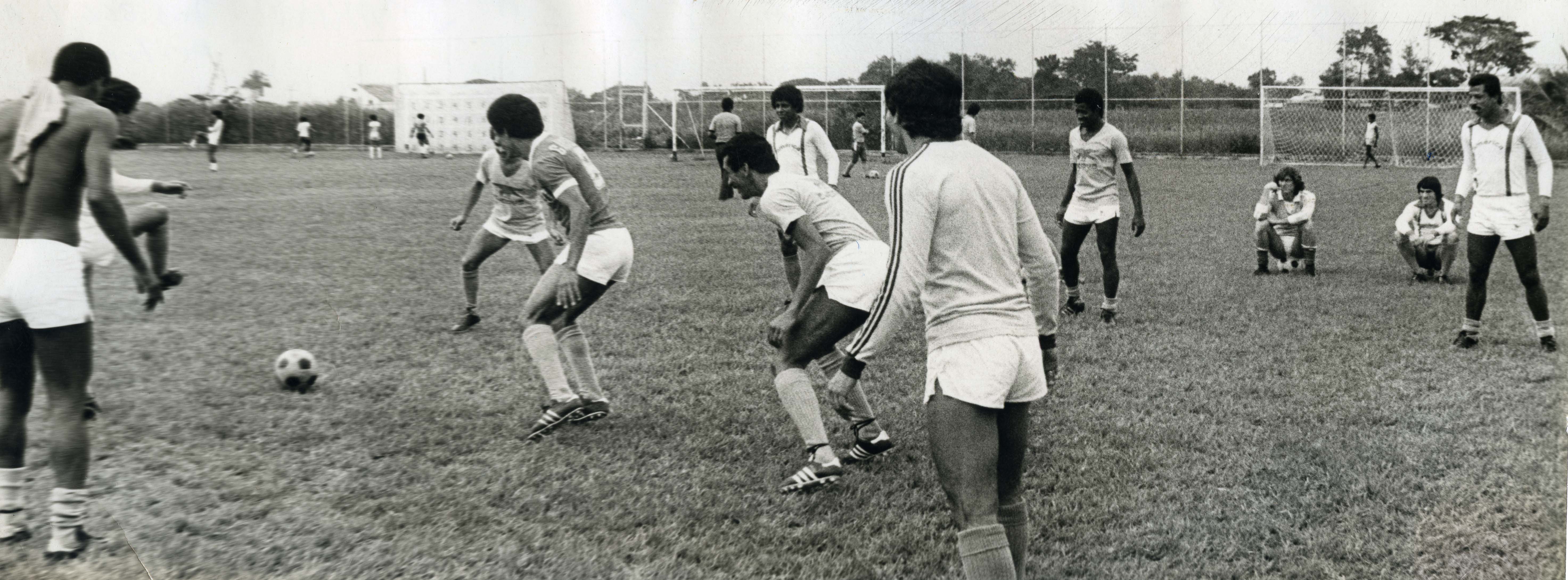 En el pie de foto dice lo siguiente: Calentamiento, Jugadores del América jugando al bobito, Sede Cascajal en Jamundí. Fotografía en blanco y negro