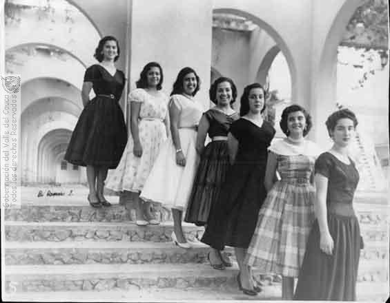 s. n., s. n., s. n., s. n. & s. n. (1955). Primeras bachilleres del Liceo Femenino en las instalaciones del Hotel Guadalajara: Luz María Castillo, Rita Cruz, Celina Marulanda, Lili Calderón, Teresita Vergara, Chila Márquez, Clara Inés Vélez & 603296. BUGA: Biblioteca Departamental Jorge Garces Borrero.
