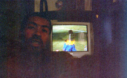 Plano medio. Autorretrato con partido de fútbol en televisión. Subexposición difumina sujeto entre la sombra.