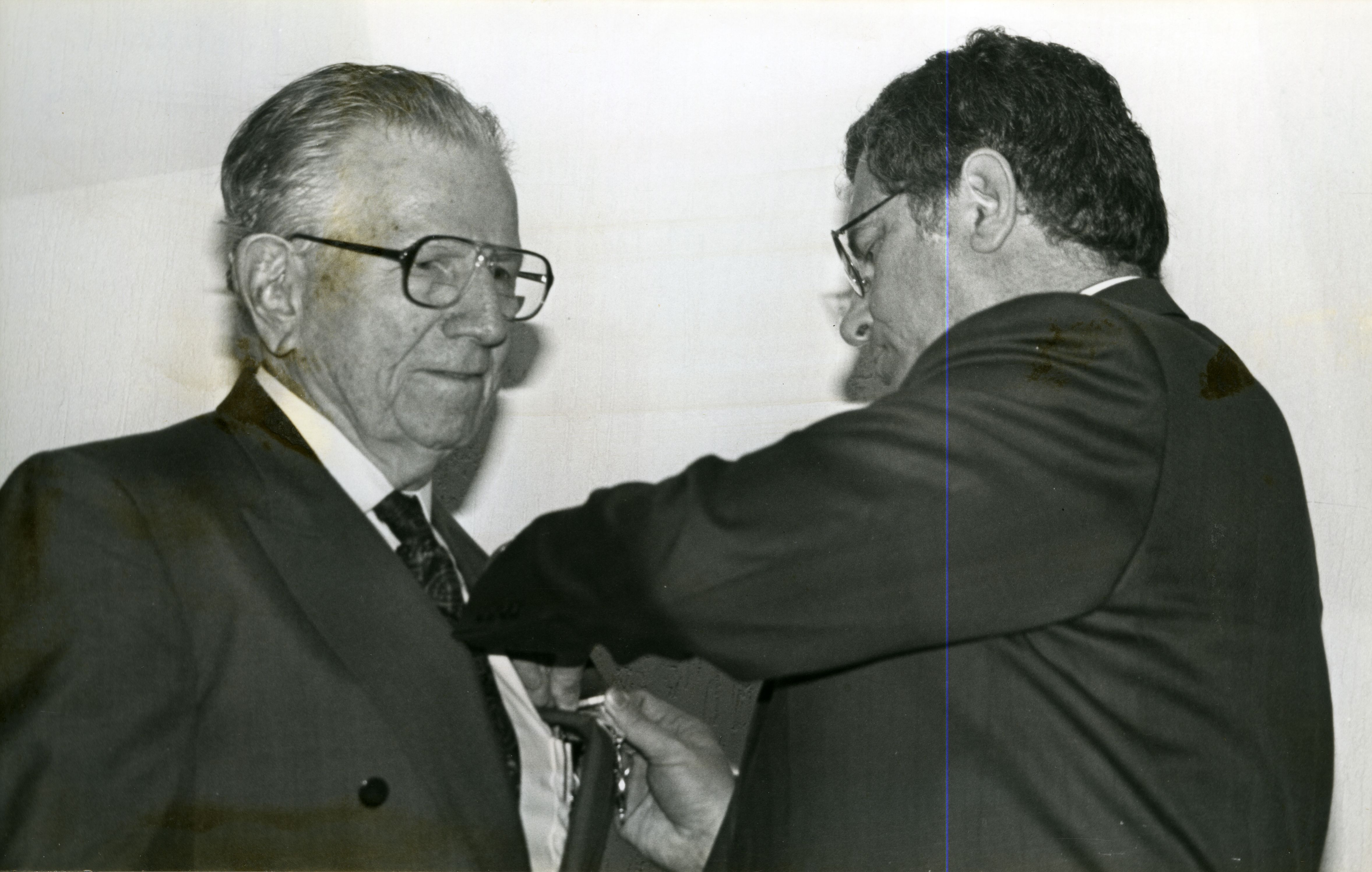 | dc.description.abstract | Al reverso de la fotografía se anexa recorte:" Bodas de oro profesionales. Cali 12/94- El gobernador Carlos Holguin Sardi Condecoro con la medalla "Ciudades Confederadas del Valle del Cauca" en la categoria Gran Cruz al médico especialista, Arturo Velez Gil, quien esta celebrando 50 años de ejercicio profesional, el facultativo fue secretario de salud departamental en dos ocasiones, secretario general del ministerio de salud y el primer director que tuvo el hospital universitario "Evaristo Garcia" | spa |