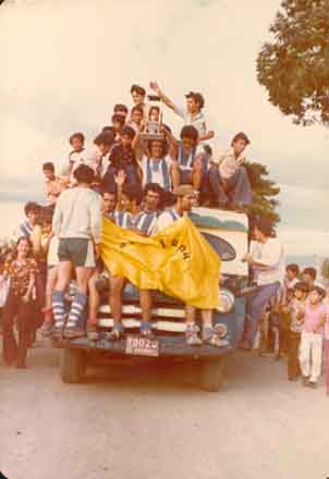 Equipo de fútbol Barcelona celebrando un triunfo. Yotoco, 1975.