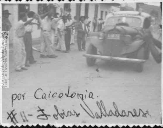 Carrera internacional de autos Buenos Aires-Caracas a su paso por el municipio de Caicedonia que tuvo su propio representante con el joven Tobías Valladares. Caicedonia, 1948.